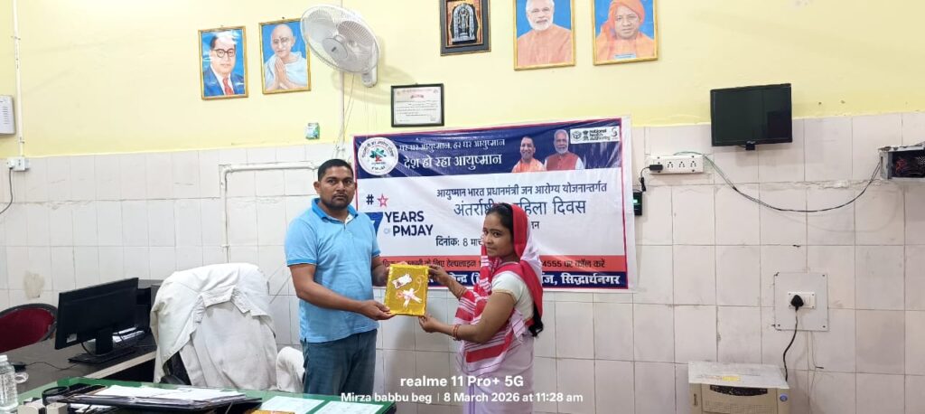 रविवार, 8 मार्च 2026 को अंतरराष्ट्रीय महिला दिवस के पावन अवसर पर सामुदायिक स्वास्थ्य केंद्र (CHC) बेवा, डुमरियागंज में एक भव्य कार्यक्रम का आयोजन किया गया। इस कार्यक्रम में ‘आयुष्मान भारत प्रधानमंत्री जन आरोग्य योजना’ के तहत उत्कृष्ट कार्य करने वाली महिला स्वास्थ्य कर्मियों को उनकी सराहनीय सेवाओं के लिए सम्मानित किया गया।